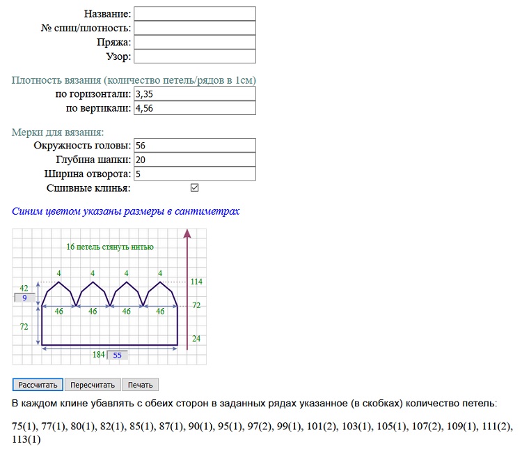 Добавила модель еще и с 5 клиньями, решила, что лично мне такой не хватает :haha: . Добавила пересчет, чтобы можно было регулировать высоту скоса макушки. Можно отрегулировать количество петель, оставляемые на клиньях. Думаю, еще чего-то не хватает. Возможно стоит добавить выбор сшивная/цельновязанная, пришла к выводу, что при сшивании не стоит после разделения вязания на клинья не стоит убавлять в первом же ряду. Убавка и так произойдет за счет того, что крайняя петля станет кромочной. Исправила ошибку в 6-ти и 4-х клинках. Там вылазила ошибка при расчета шапки с отворотом.