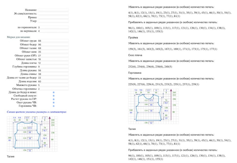 Совсем забыла объяснить как ей пользоваться. После ввода размеров нажать кнопку "Расчет", внести изменения можно там, где указаны сантиметры, просто щелкнуть мышкой и ввести нужный размер. Нельзя изменить только три размера: ширину проймы, длину рукава до оката и расстояние от низа полочки или спинки до проймы - эти размеры рассчитываются. Изменить их можно меняя другие значения: высоту оката рукава, длину рукава, длину изделия, глубину проймы. После внесения всех изменений нажать кнопку "Пересчет". Если вновь нажать "Расчет", то все изменения исчезнут, расчет произведется заново по меркам.