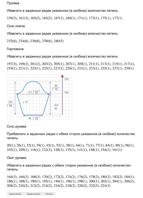 skvesha, добавлю. Но! Следить за количеством петель придется уже самостоятельно, пересчитать, как сантиметры, будет уже нельзя. Так же добавлю возможность корректировки рядов при убавлении/прибавлении петель при расчете рукава и талии.
