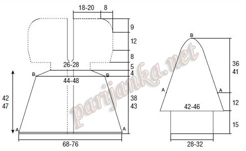 да низ по выкройке, а с 72 ряда по 1 петельке убавлять до 151 ряда.