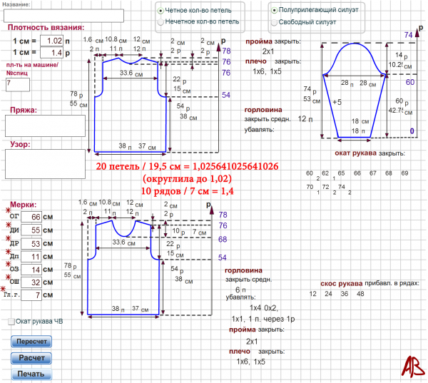 Чего-то я совсем туплю... Я побочно еще вяжу свитер сыну. Петельная проба: 19,5 см = 20 петель, 7см = 10 рядов. (толстая пряжа).При расчете модели 27 , если я считаю петельную пробу 19,5/20= 0,98, 7/10=0,7, то получается очевидно не верная выкройка (по вертикали очевидно), а если 20/19,5=1,02, 10/7=1,4, то по крайней мере на глаз верно выходит. Так я все же не понимаю как правильно высчитывать плотность?