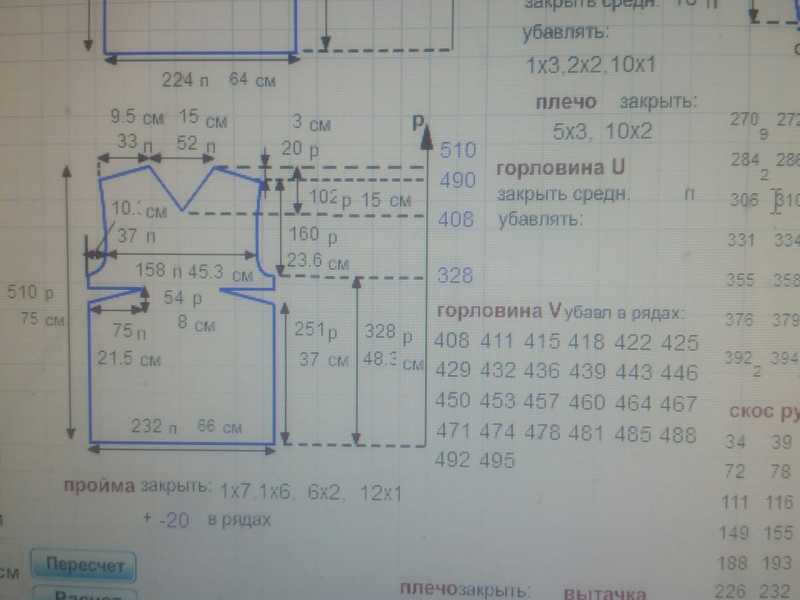 К сожалению весь расчет и введенные мерки не видно. по пройме к плечу должны идти прибавки. около 1см. У Вас там +-20 петель. Минуса быть не должно и петель должно быть не 20.
