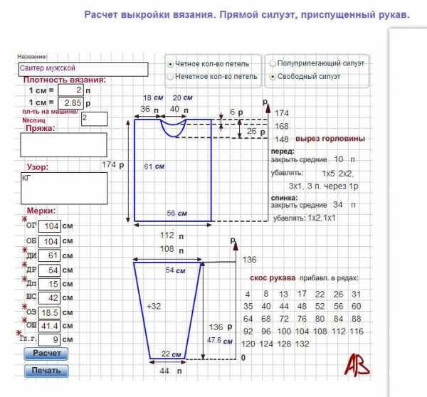 Мужская выкройка вязания прямой силуэт, прямой рукав.