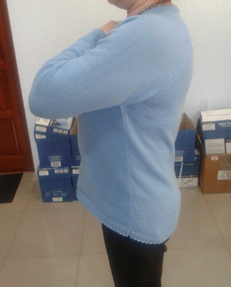 Я перевязала свой голубой джемперок (выкладывала на предыдущей странице). Убавила на 2см дину рукава и на 1 см длину плеча. Рукав получился нужной длины. Теперь другая бяка вылезла..... планку не куда делать, не хватает глубины горловины...... особенно по спинке. Перевязывать уже не буду, обвяжу крючком, на работу и так сношу.