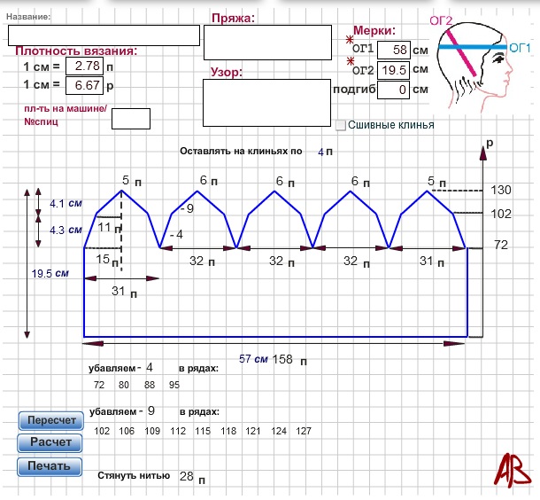 Делаю расчет модели 38 шапка с 4-мя клиньями по моим данным расчет в высоту шапки не верен ОГ1=58 ОГ2=19,5 плотность- 6