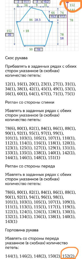 По горловине рукава, у меня пока только одна мысль. Набрать на 2 петли меньше, не 50, а 48. Тогда сохранятся все убавки по реглану спинки и переда, а после них останется 7 петель. Так как в горловину петли мы по переду добавили, то их удаление из рукава, я полагаю, компенсировано. Поэтому 152 ряд попросту убавки исключаем. Либо набор 50 петель сохранить, а 2 последние убавки распределить по между оставшимися рядами. Вроде это ничего не нарушит, так как это горловина, просто изгиб немного изменится. Больше мыслей нет