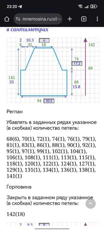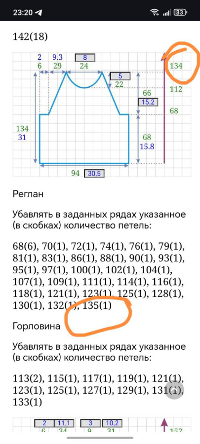 Я пытаюсь разобраться, вот прикинула, что по переду убавку в 135 ряду можно убрать и добавить её в горловину. Т.е. в горловине в 115 ряду сделать не 1, а 2 убавки. Тогда все сойдёт я и по рядами и по петлям. Я в ту сторону мыслю?