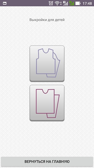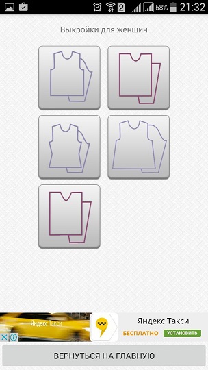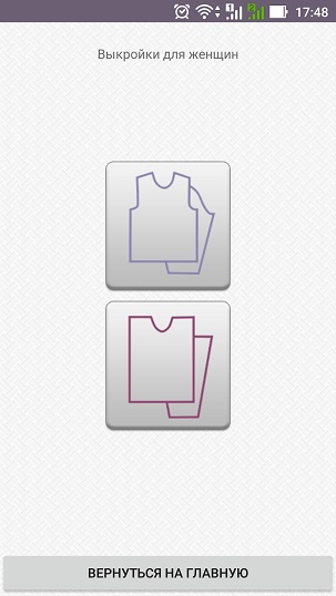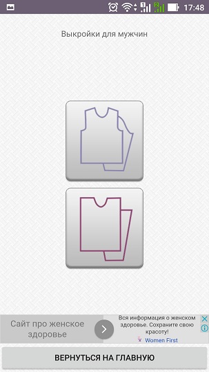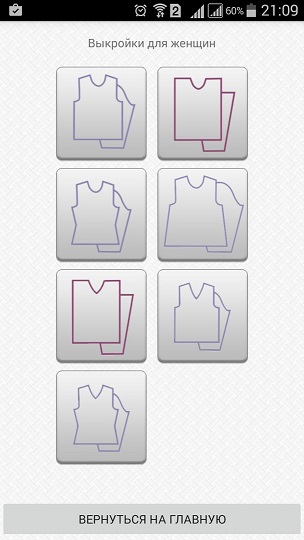 На настоящий момент в мобильном приложении доступны 6 выкроек: выкройка с втачным рукавом, с прямым рукавом для женщин, мужчин и детей.