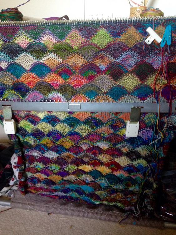 Эта деталь на вязальной машине связана интарсией( когда-то очень давно я вязала похожее на "Кашубке"- польская вязальная машина, в СССР она стала потом "Северянкой") Короче, вязать это полотно можно на любой однофонтурной машине, но дело в другом, дело в пряже...если посмотреть внимательно,то концы пряжи выведены справа, а на столе стоят всего две боббинки с пряжей секционного крашения, меняя которые в челноке можно добиться этого интересного