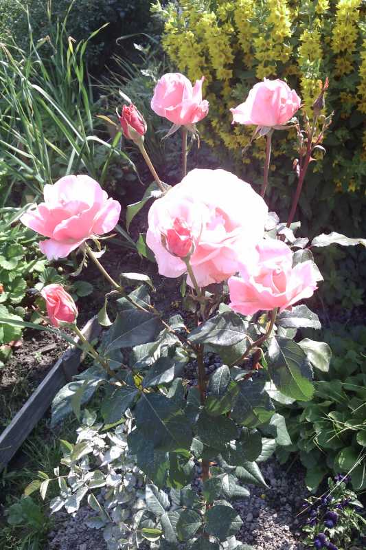 Вдоль дорожки к дому практически одни розы, возле винограда куст по виду напоминает шиповник, пока бутон не раскрыт то роза розой, а как раскрывается то цветок как у шиповника, только потом плода нет. Цветет с середины июня и до самых холодов очень обильно, вот поближе