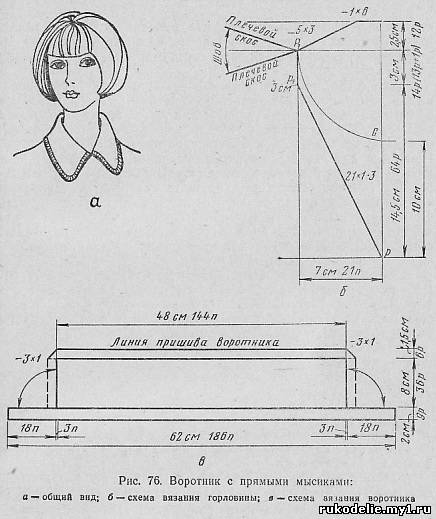 Воротник с прямыми мысиками, окантованный двойной бейкой (рис. 76, а). Воротник состоит из прямого участка и окантовочной бейки. На выкройке (см. рис. 60, б) от точки С вниз (рис. 76, б) по линии середины переда отложить 10 см (5...10). Поставить точку р. От точки Р1 вниз провести вертикальную прямую, по которой откладывается 3 см. Полученную точку р1 соединить прямой линией с точкой р. Каждая половина переда от горловины вяжется раздельне. При вязании спинки по горловине петли закрыть «косичкой».