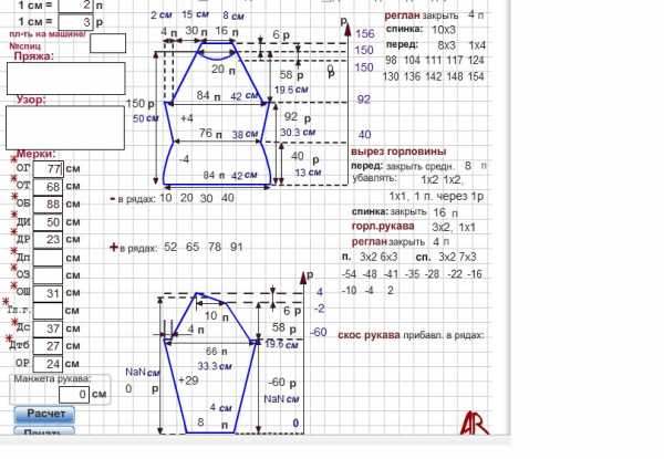 krutchinina, посмотрите на выкройку внимательно. Мерки вносим слева в "окошки", нажимаем расчёт. Видите цифры на выкройке? Это и есть расчёт вязания. Если что-то надо изменить в см, цифры стираем и пишем новые. Нажимаем перерасчёт.