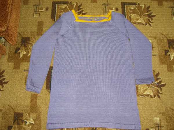 здравствуйте милые подруженьки!!!Объявляюсь растерянная и потерянная и опять ко всем за советом, что не так у меня. Я опять со своей туникой с большим воротом. Вообщем взяла модель №4 (реглан, прямой покрой)Рассчитала все по размерам, отняла от верхних точек (спинки , полочки и рукавов)по 8 см (у меня получилось по 45 рядов), вывязала, сметала, ворот еще пока не вязала, решила примерить и пришла в полный улет, посмотрите что получилось.Может мне надо было взять приталенный силуэт и укоротить длину туники, смотрится на теле ужасно, знаете еще мысль пришла может мне изменить толщину нити, вязала в 4 сложения (П/Ш), а надо было в 3 взять, может получше было бы. Вообщем я незнаю, что мне делать,что изменить, так-то должно получится с воротом, должен лечь как бы хотелось,когда пришъеться, но до этого надо мне продумать низ туники.