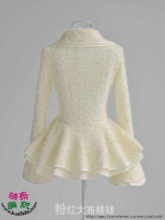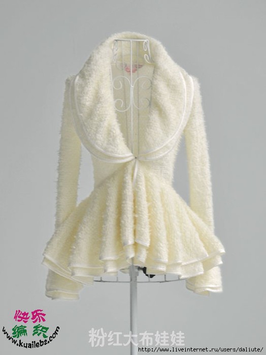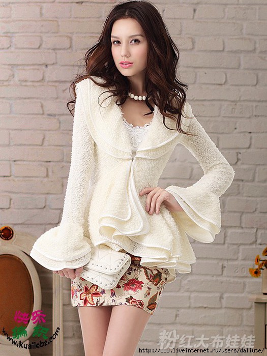 За основу я взяла выкройку 29. Начала вязать (уже связала спинку и рукава). Воротник планирую связать шальку. Размышляю над полочками, пока не получается сделать такой скос. :??? И еще думаю над тем, как красиво присоединить воланы. :pofig:
