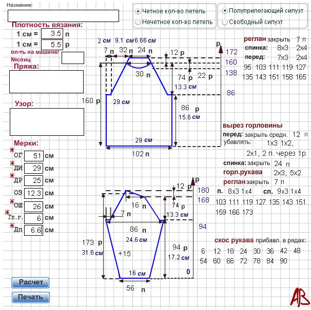Я сделала расчет, но там ерунда получается с количеством убавлений реглана рукава. Такое бывает при некоторых сочетаниях размеров и плотности вязания. Я стараюсь это отслеживать, исправлять, чтобы программа была универсальна.