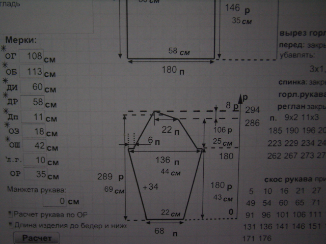 у меня с расчетом тоже что то не получается, рукав реглан... по меркам ОЗ - 18см. , а выдает расчет что 22см. как будто..