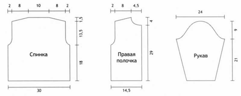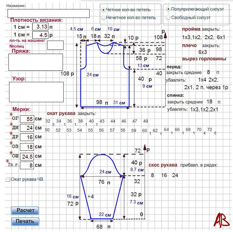 выкройка №18 - короткий рукав. Рукавчик вяжется чуть меньше. По тем же меркам, но с обычным рукавом расчет выглядит так: