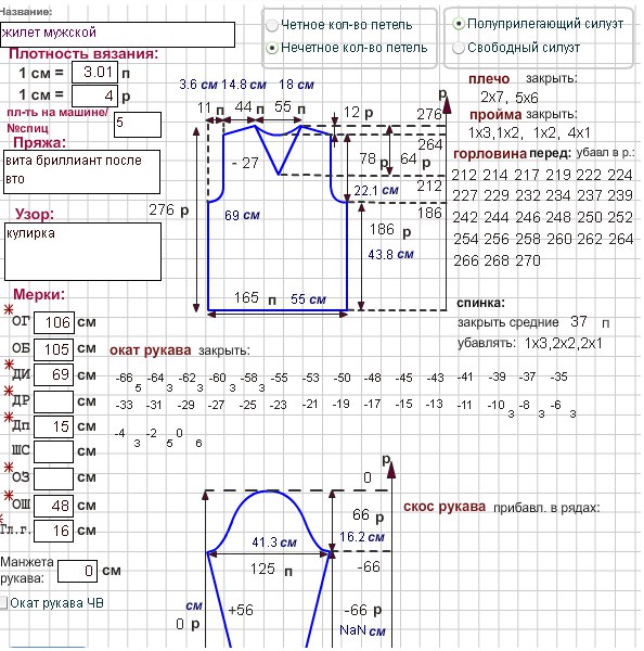 Всем доброго дня девочки! Подскажите пожалуйста как вы строите выкройке для мужского жилета. Я связала по 19 выкройке, но потом уже поняла свою ошибку, не просчитала размер обтачки горловины и проймы и жилетка получилась, как бы с маленькими рукавами. Как нужно вводить размеры, чтобы пройма и горловина уменьшились на размер обтачки. На 60 выкройке есть обтачка для горловины, а вот для проймы, как просчитать, что бы не ошибиться с размером. Может ширину плеча уменьшить. Объясните мне пожалуйста, сама я выкройки строить не умею, поэтому мне трудно сообразить, где прибавить, а где убавить. Прикрепляю выкройку по которой вязала. ОШ увеличивала.