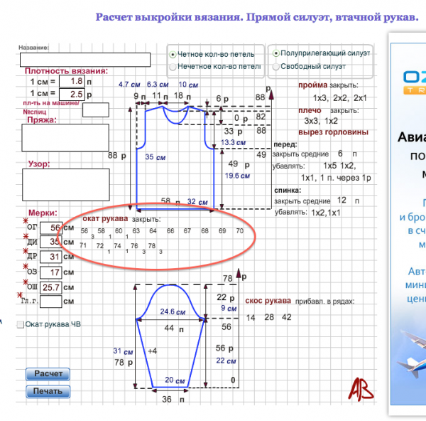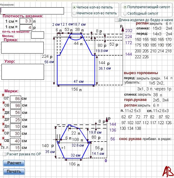 А я ставила галочку рядом со сторочкой "Расчет рукава по ОР" и у меня получилось прибавить по скосам по 10 п. с каждой стороны и указаны ряды, в которых нужно это сделать. Вроде все получается замечательно и с прибавлениями и с убавлениями:good: