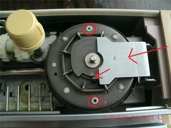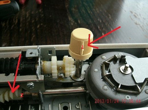 Шаг 4 - фото 4 и 5. Итак, смотрим что бы правильно выставилась еще одна деталь....Это зубчатая пиндюрина слево на фото4...зубчик(1)фото 5) должен встать над штырьком самым кончиком (2)фото5)... чтоб было легче настраивать, нажимаем кнопку перемотки перфокарты(1)фото4 ). Нажимаем и отпускаем пока зубчит точно не встанет на штырек, встать должен самый кончик зубчика, одновременно двигаем в нужном направлении вал с зубчиками(2) фото 4) Это самый сложный момент, возможно понадобиться несколько раз откручивать и закручивать болтики с огранечителя пока штырек и зубчик достигнут своего правильного положения. Поэтому советую прикручивать на время теста только один болтик на огранечитель. болты действительно очень мягкие. когда достигнете идеального соотношения штырек-зубчик, тогда прикрутите основательно.