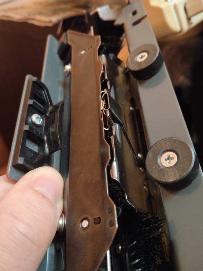 Машина старая, много работала, поэтому могли ослабнуть болтики. Но передняя фонтура должна двигаться по отношению к задней- такая функция у неё. Еще посмотрите соединительный мост: 1.Должен плотно прилегать к задней каретке, 2. Соединительный язычок должен входить в рамку минимум на 5 мм..