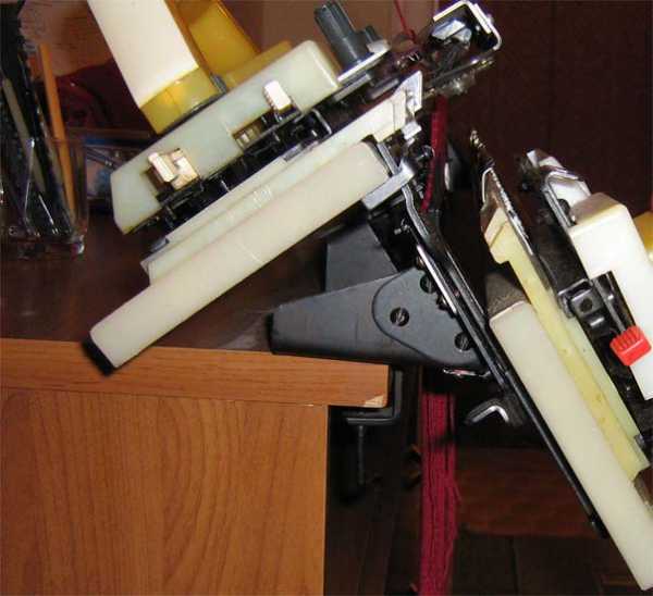 Вот так располагаются фонтуры у меня. По отношению к столу видно, что у Ани полотно идет в некотором расстоянии от стола а у меня гребенка с грузами при вязании первых рядов иногда ложится на стол... :-))) Это можно как-то отрегулировать?