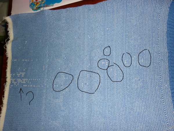 Девочки, помогите :worthy: я в просто в шоке. Вяжу дфж нитка 32/2, плотность 2/2, пруток для тонкой вязки вставлен, кнопки пике включены, какие-то непровязы получаются. Связала вчера половинку юбки, вроде нормально получилось, непровязы били, но одиночные, сразу их ликвидировала, а сегодня связала вторую половинку, сняла с машины и чуть в обморок не упала, две полосы непонятного происхождения :pofig: и третья на рисунке,