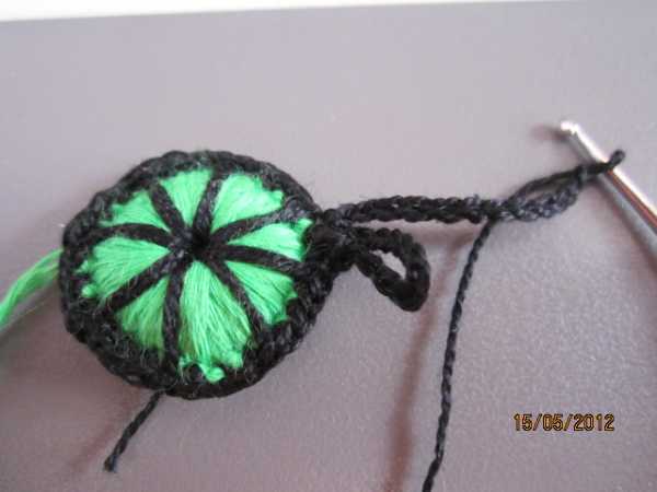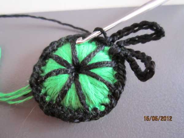 6.Дальше нам понадобится черная нить( чуть тоньше основной) присоединяем к краю нашей "пуговки".
