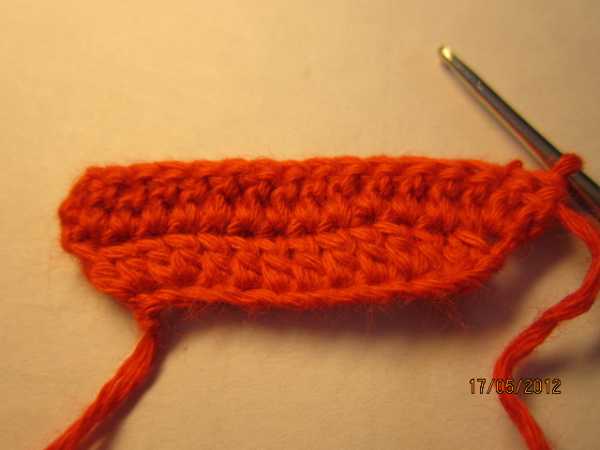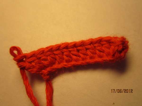 1р. - цепочка из 10 воздушных петель(вп)+ 3 вп для подьема, переворачиваем вязание вяжем с другой стороны после каждого ряда.