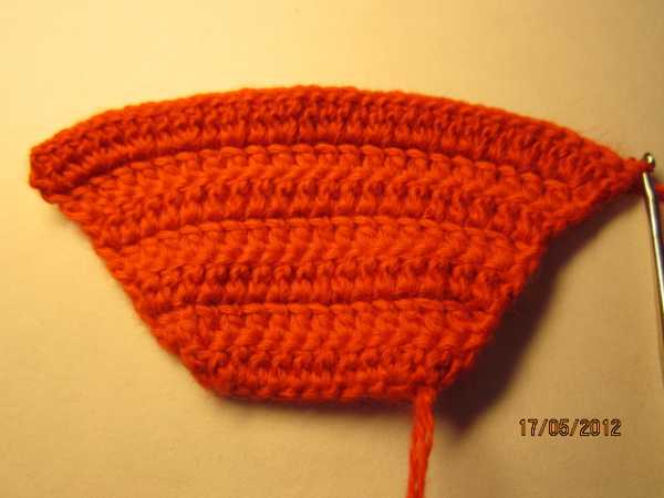 3. В те же петельки (т.е. первого ряда, куда были провязаны 12 сбн), провязать 16 сбн, распределяя примерно так 3сбн, 2сбн, 3сбн, 2сбн, 3сбн, 3сбн.