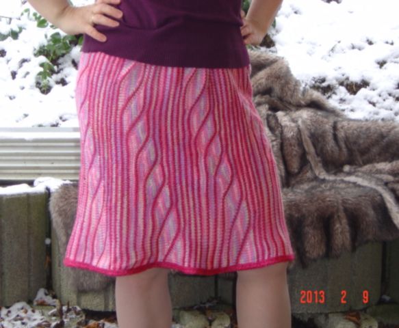 ширина всего полотка 92 см, длина 52 см, расширение не делала, вязала просто прямоугольником . А из-за того что начинала всегда с правого края, то этот край получился слегка как бы слабее вязка что ли, ну в общем немного больше, я потом когда отпарила то это стало заметно и я этот край пустила на низ, поэтому она выглядит снизу слегка расклешенней, а сверху пояс с вставленной резинкой. А так особых расчетов не делала, вязала просто прямоугольник.