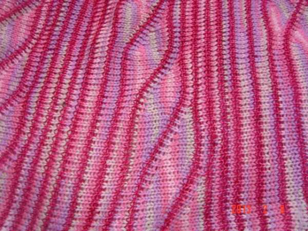 вязала поперек, набрала сразу на длину юбки, число петель кратное 10 мне просто так удобнее делить на секторы, провязала два ряда темной пряжей по всей длине, перешла на розовую пряжу, включила рычаги чв, каретка справа, справа оставила 15 петель в РП, остальные убрала в ПНР, провязала 15, обвив, назад 15, 2 петли выдвинула в ПНР, провязала 13, обвив, назад и так пока не осталось справа на краю 5 петель в РП, переключить рычаги, провязать весь ряд два ряда, затем темной нитью так же два ряда, опять идем на правый край, включаем рычаги ЧВ, оставляем справа 15+10 петель в РП, остальные выставляем в ПНП, провязываем , каретка слева, убираем справа от края 15 петель в ПНП, дальше вяжем по формуле - с правой стороны этого сегмента 2 петли выдвигаем в ПНП, а с левой стороны сегмента 2 петли выдвигаем из ПНП в ПР, то есть в работе 10 петель, но они смещаются в сторону правого края, и так 5 раз, потом опять проход по всей длине, и опять сегмент но теперь от края начинаем считать 15+10+10