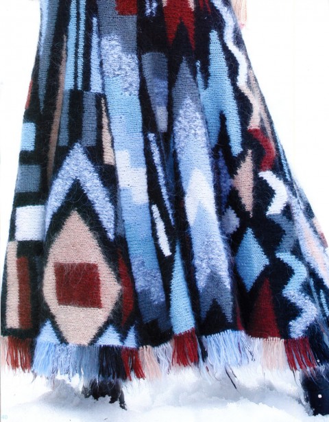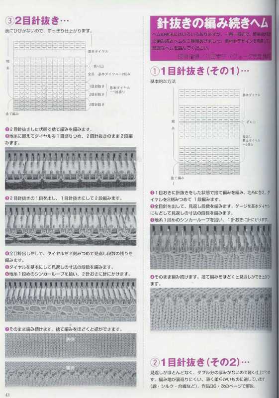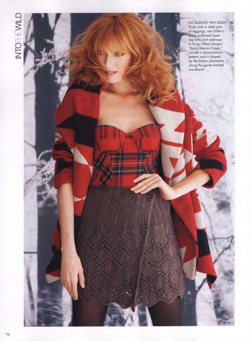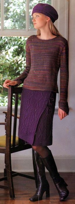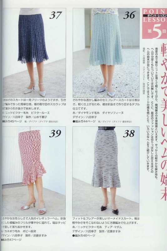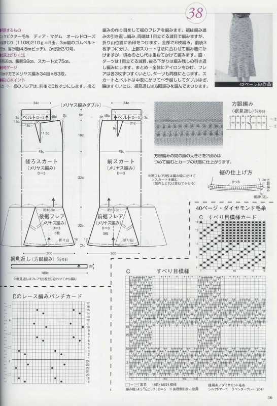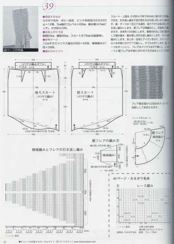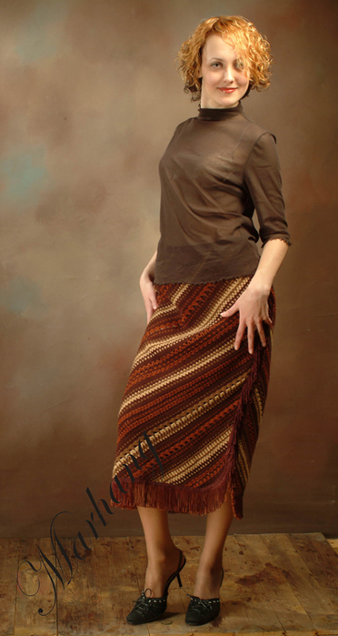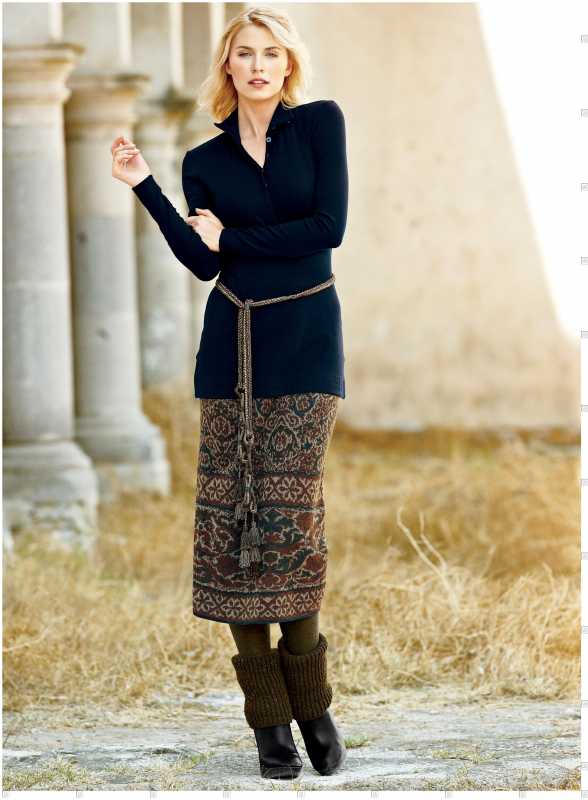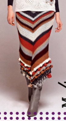 Поперечно-вязаные расклешенные юбки можно украсить, вывязав орнамент или фанговый узор по центру клина, можно расширения клина вязать отделочным цветом, по низу юбки можно вывязать кайму ажурным или мережково-фанговым узором и т.д. Низ юбки можно обвязать крючком или в процессе вязания выполнять утолщенную "косичку", тогда не требуется дополнительного уплотнения края.