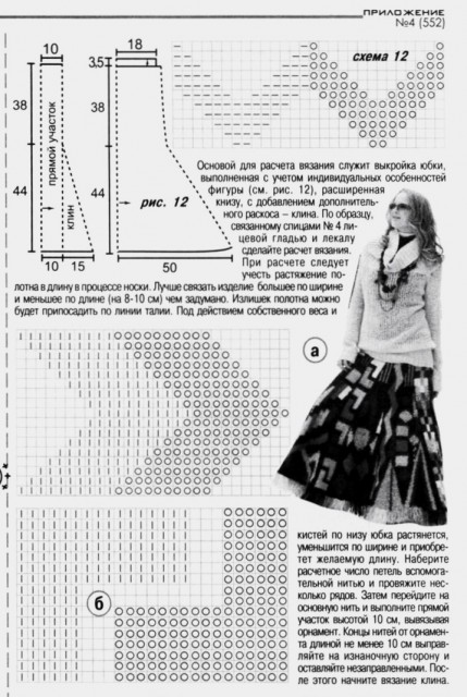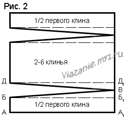 2. Для расчета одного клина по линии талии, окружность талии плюс прибавка на свободу облегания умножается на плотность по вертикали и делится на число клиньев. 76 + 8 см (на свободу облегания) = 84 см. 84 х 4,5 = 378 рядов. 378 : 6 = 63 ряда. Ширина клина вверху = 63 ряда. Раскос Б1В = 4 см. 4 х 4,5 = 18 рядов. Раскос с двух сторон составляет 36 рядов. Ширина клина внизу = 63 + 36 = 99 рядов.