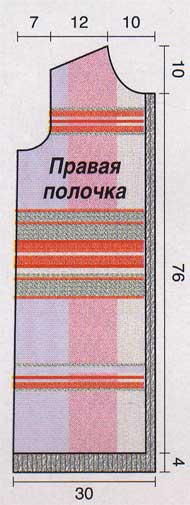 Правая полочка: пряжей 7 наберите 35 п. и для планки вяжите 4 р. полой резинкой, 2 р. резинкой 1/1, затем вяжите платочной вязкой, равномерно прибавляя 2 п. в 1-м р. (всего = 4 см). Далее вяжите лиц. и изн. гладью с цветными вставками по той же схеме спинки (только на указанной части), прибавляя 1 п. в 1-м р. и выполняя первые 3 п. лиц. гладью и пряжей 7. Слева выполняйте боковые убавления и пройму, как на спинке. На высоте 76 см от планки (= 126 р.) закройте справа для горловины в каждом 2-м р. 1 раз 3 п., 4 раза по 2 п., 1 раз 1 п. Одновременно на высоте 17 см от начала проймы (= 28 р.) выполняйте плечо, как на спинке.