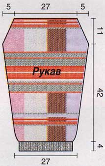 Рукав: пряжей 7 наберите 32 п. и для планки вяжите 4 р. полой резинкой, 2 р. резинкой 1/1, затем 4 р. платочной вязкой, прибавляя равномерно 2 п. в 1-м р. (всего = 4 см). Далее вяжите лиевой и изнаночной гладью с цветными вставками по схеме. С обеих сторон прибавляйте в каждом 10-м р. 6 раз по 1 п. На высоте 42 см от планки (= 70 р.) убавляйте с обеих сторон для оката в каждом 2-м р. 4 раза по 1 п., в каждом 4-м р. 2 раза по 1 п. На высоте 11 см от начала оката рукава(= 18 р.) закройте оставшиеся 34 п.