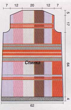 Спинка: пряжей 7 наберите 68 п. и для планки вяжите 4 р. полой резинкой, 2 р. резинкой 1/1, затем вяжите 4 р. платочной вязкой, равномерно прибавляя 6 п. в 1-м р. (всего = 4 см). Далее вяжите лиц. и изн. гладью с цветными вставками по схеме, прибавляя 3 п. в 1-м р. С обеих сторон убавляйте по 1 п. через 28 р. и по 1 п. еще через 22 р. На высоте 64 см от планки (= 106 р.) закройте с обеих сторон для пройм в каждом 2-м р. 1 раз 5 п., 4 раза 1 п. На высоте 17 см от начала пройм (= 28 р.) закройте с обеих сторон для плеч в каждом 2-м р. 3 раза по 4 п., 1 раз 3 п. На высоте 5 см от начала плеч (= 8 р.) закройте 25 п.