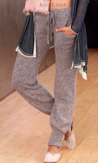 Я вязала без выкройки- поперечным вязанием , начиная с бросовой нити-от бокового шва к шаговому шву, также заканчивая бросовой нитью...все четыре детали, ...после стирки и ВТО навешивала пояс и манжеты. карманы- в боковых швах( мой рост- 1.57 )