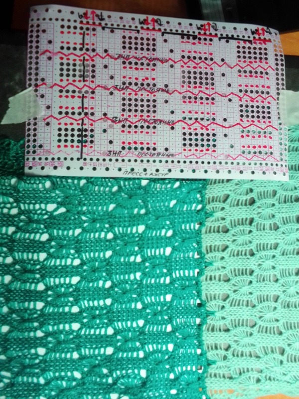 Девочки, может кому пригодится пк ажур + пресс. Образец на изн и лиц стороне. На ПК не допробитые столбики - иглы освободивщиеся после ажурки выводятся ЗНП "А", но после прессовых рядов обратно вводятся вручную в рабочее положение.