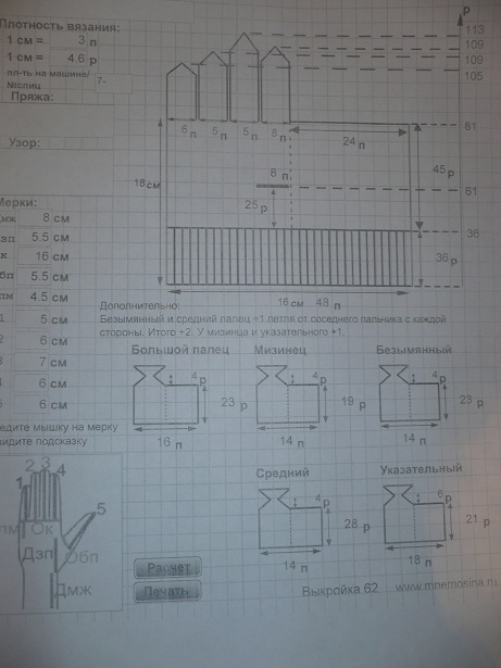 вот расчет.но что то я не пойму :???: как вывязать пальчики.и как взять петли с графы дополнительно. :???