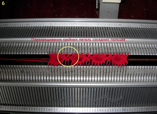 *Чтобы между пальцев не было дырочек , перекрещиваем крайние петли (7-ю петлю передней игольницы перевешиваем на 1-ю петлю задней игольницы соседнего пальчика.)