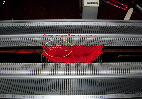 вручную провязываем 7 петель(для правой перчатки на передней игольнице для левой –