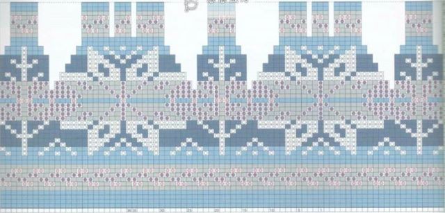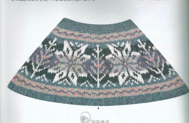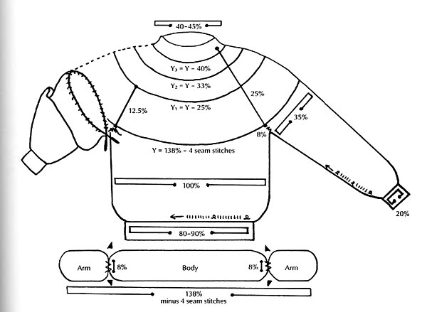 Хотя свитер с круглой кокеткой выглядит сложным, взать его не трудно.Для расчетов очень хорош процентный метод Э. Циммерман, то есть, все размеры расчитываются как проценты от главной мерки — объема груди, которая и берется за 100%.Корпус и рукава вяжутся раздельно до пройм. Затем соединяются на длинные круговые спицы и вяжется кокетка. Простейший способ задать ее форму — это разместить три ряда убавлений между полосами узоров. Для человека среднего сложения высота кокетки от подмышки до горловины составляет 25% от обхвата груди. Нужно разделить глубину кокетки на 3 секции. До середины кокетка вяжется без убавлений. Первое убавление делается на середине кокетки. Ряд убавок вяжется так: 2 лицевых, 2 вместе по кругу до конца ряда. Второе убавление — на высоте кокетки 2/3-3/4. В этом ряду надо убавить 33% петель в ритме 1 лицевая, 2 вместе. И последнее, третье убавление — за 2-3 см от горловины, в ритме 1 лицевая, 2 вместе, 2 вместе. Убавление этим способом удобно делать, если узор расположен в виде цветных полос, тогда ряды убавок нужно подгадать между ними.Если узор состоит из сужающихся сегментов, можно использовать следующий метод.