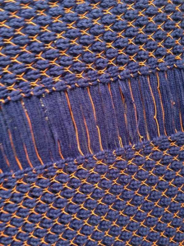Английская резинка, гартер-бар, ручное провязывание участка игл стрейчевой ниткой: