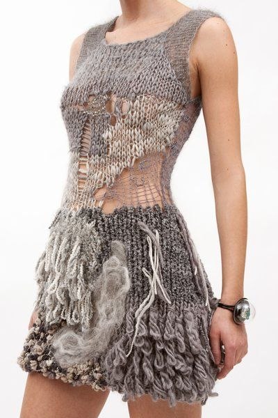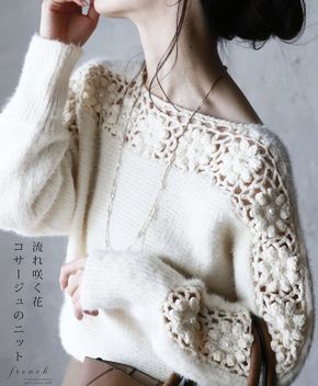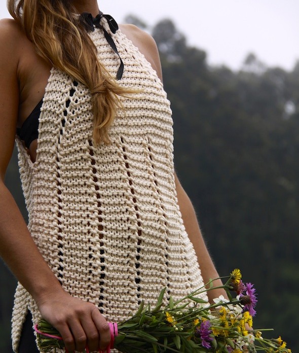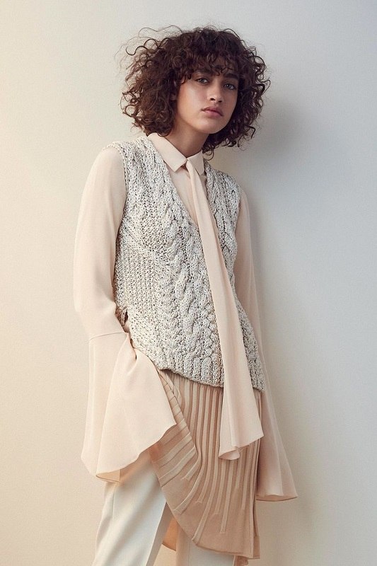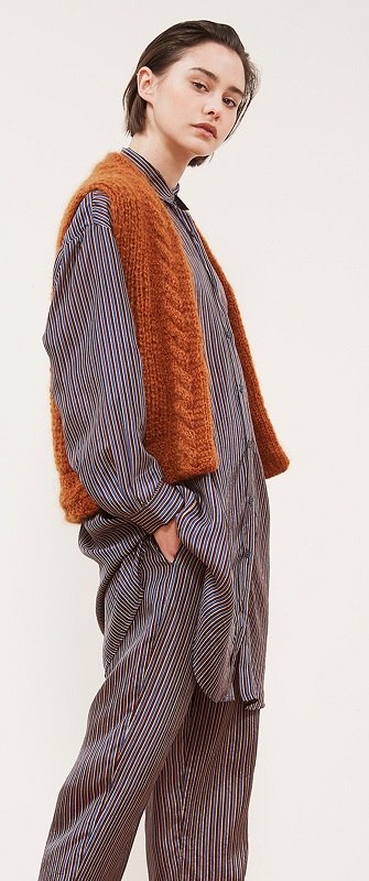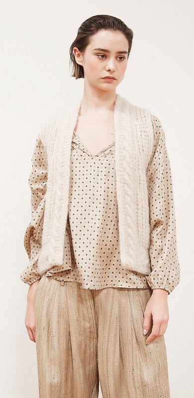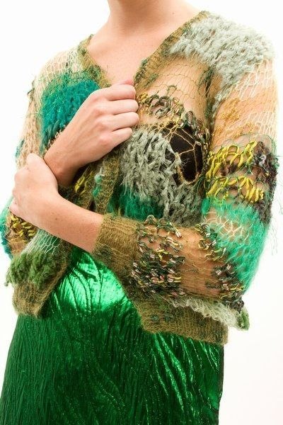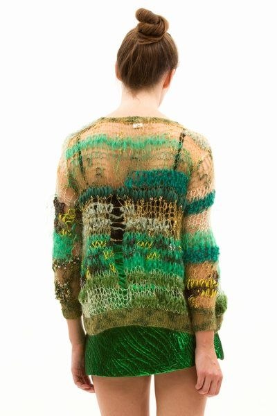 Глубокий вырез на спинке этого пуловера, связанного из пряжи секционного крашения, декорирован лентой из шифона.
