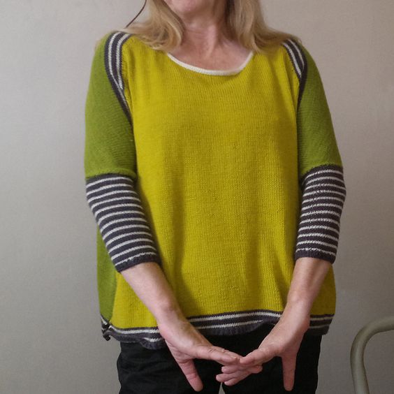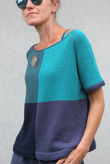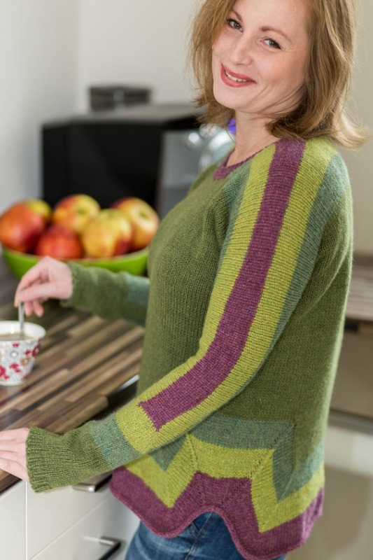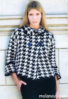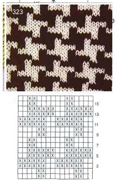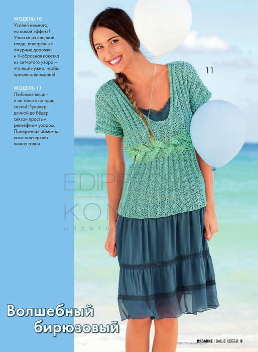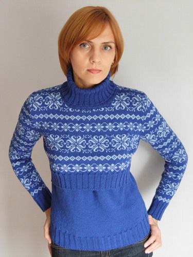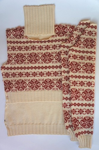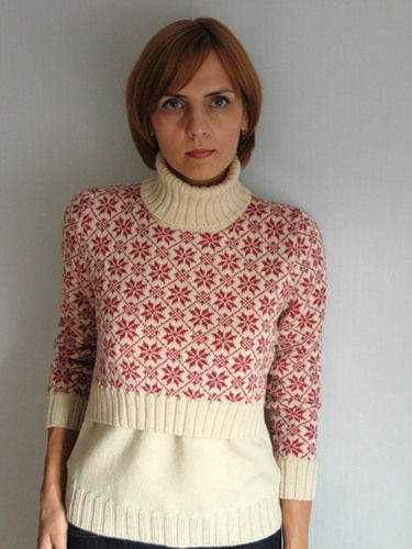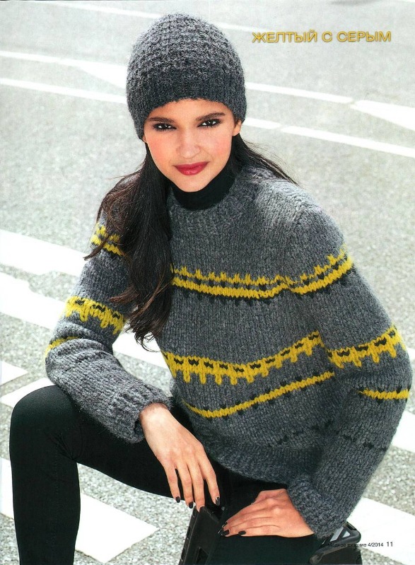 Перед вяжется из двух деталей: верхняя начинается с резинки чуть выше талии и вяжется жаккардовым узором. А под ней (вторая деталь) вяжется лицевой гладью