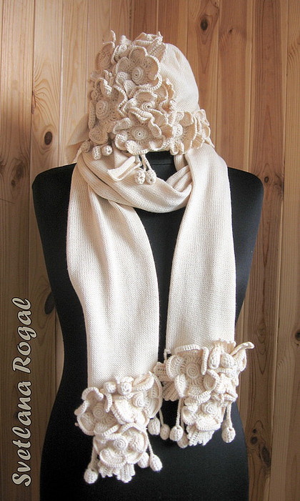 Класс!!!!!Белый комплект шапка с шарфом,цветы связаны столбиком с одним накидом, просто надо знать примерный размер.