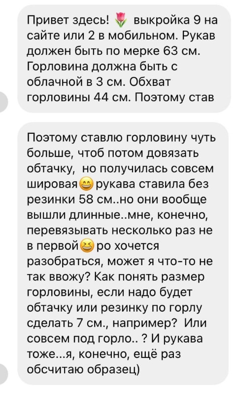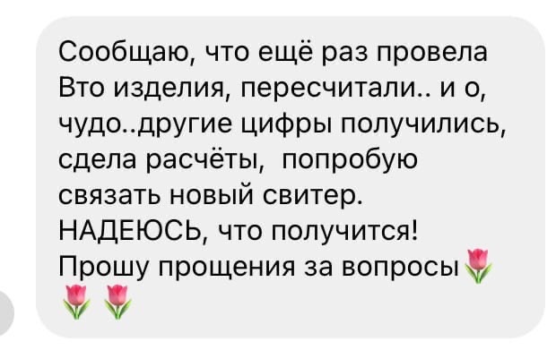 Ана, рукодельницы, привет всем! Я человек новый и здесь и в машинном вязании. По столкнулась с тем, что уже связала 3 свитер и снова не попала в размер 🤕он стал больше, рукава совсем длинные, а горловина длинная и некруглая. Что я делаю не так? Образцы стираю, отпариваю!Может в расчётах мнемосины не понимаю..совсем нервов не хватает,  а надо перевязывать😔кто поможет, подскажет? Может в WhatsApp?
