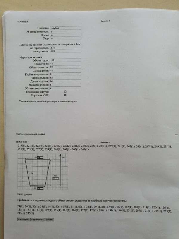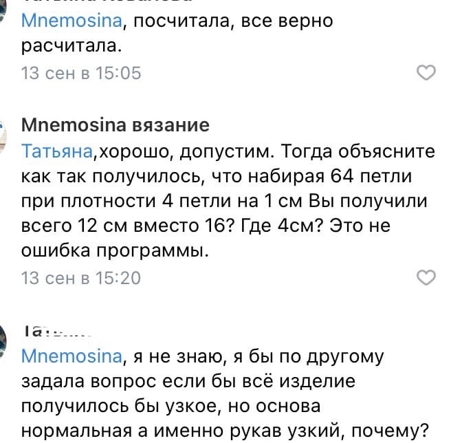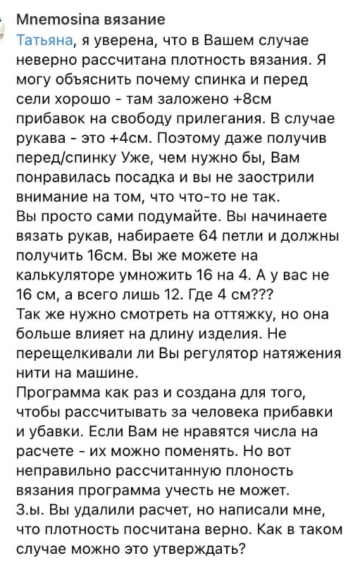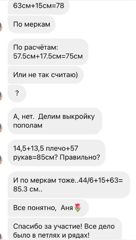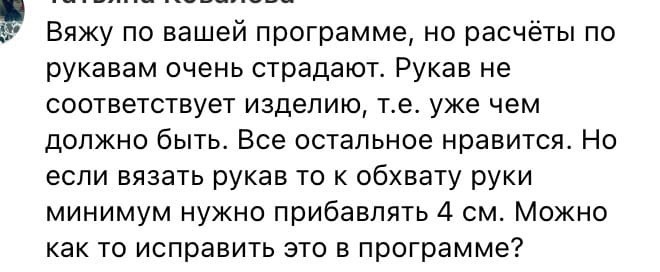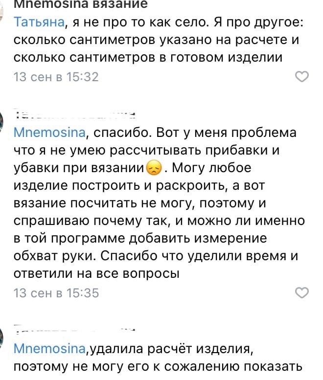 Добрый день, по поводу второго дталога я бы поделилась и своей историей. Думаю проблема тут не в расчетах а в вязальной машине. У меня тоже проблема есть, что при вязании переда и спинки результат получается чуть больше, а вот рукава получаются наоборот чуть меньше. Я сделала вывод что это можно решить если сделать рукав изначально больше процентов на 10 🤔