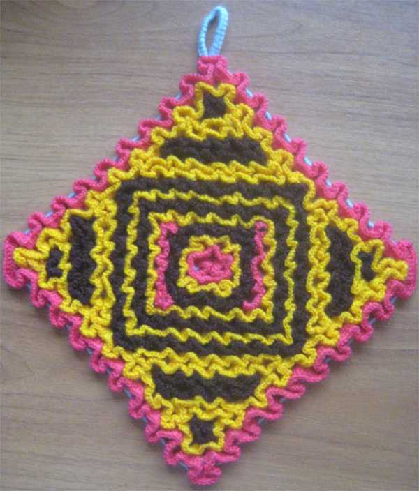 Как прихватка неудобна, а вот подставка под горячее в самый раз. Я думаю, если в таком квадрате не объвязывать середину, то получится подставка (или салфетка) под заварной чайник или сахарницу.